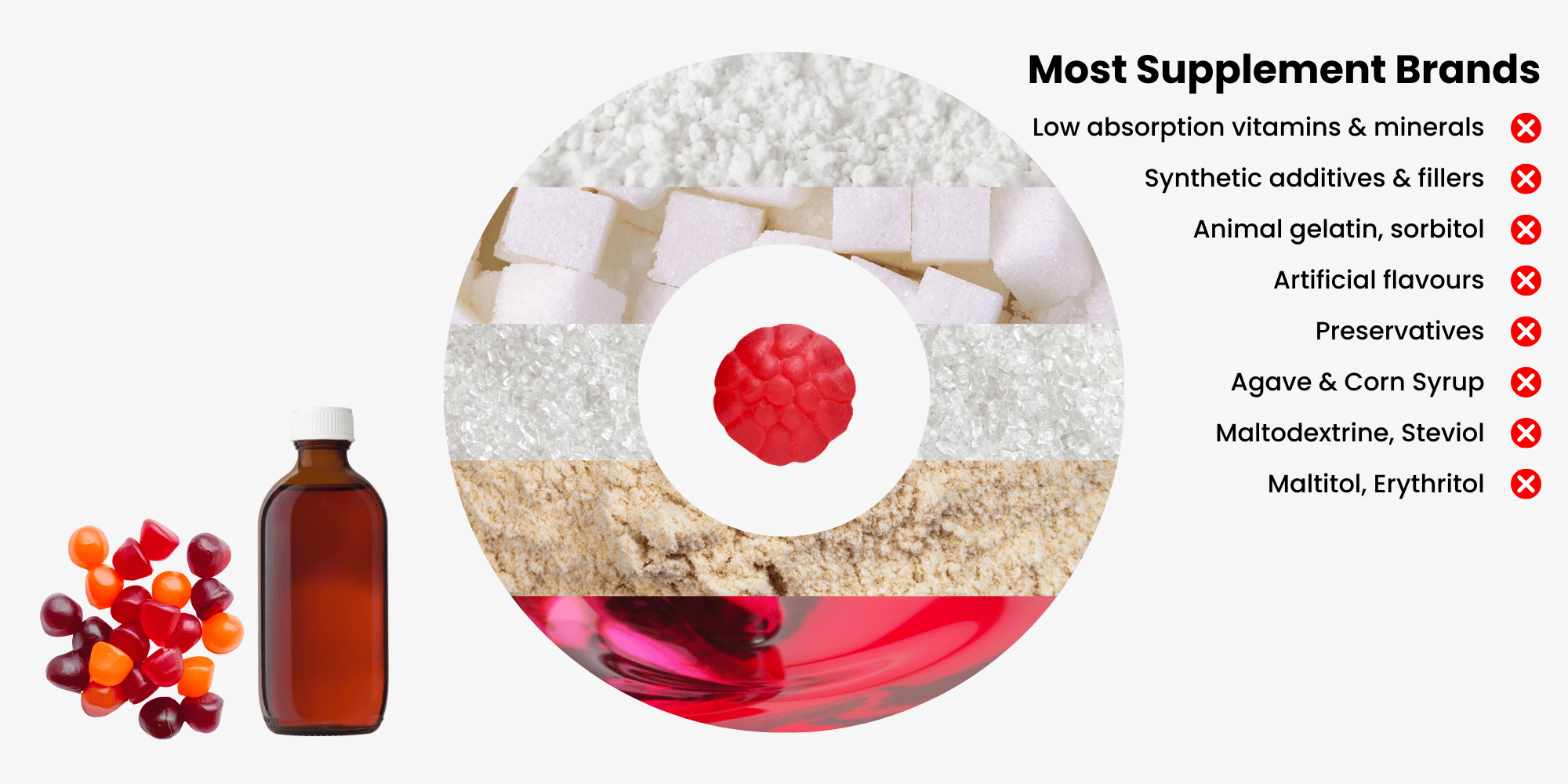 At Nuré, we advise against using gummies for several reasons. First, they are composed of more than 80% fillers (gelling agents, sugars, sweeteners...), leaving little room for the active ingredients. This results in the use of chemically inferior forms of vitamins, which take up less space but are poorly absorbed by the body. Additionally, gummies are often rich in additives, colorants, and artificial flavors, some of which are considered endocrine disruptors, which should be avoided, especially for growing children.Finally, because they resemble candy, gummies are frequently associated with overconsumption and overdosing incidents, which can be harmful.