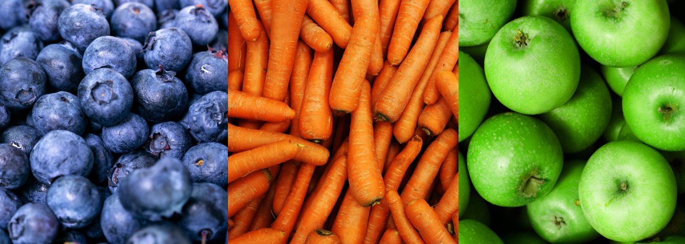 Organic blackberry, organic pomegranate, organic carrot root, banana, and beetroot.