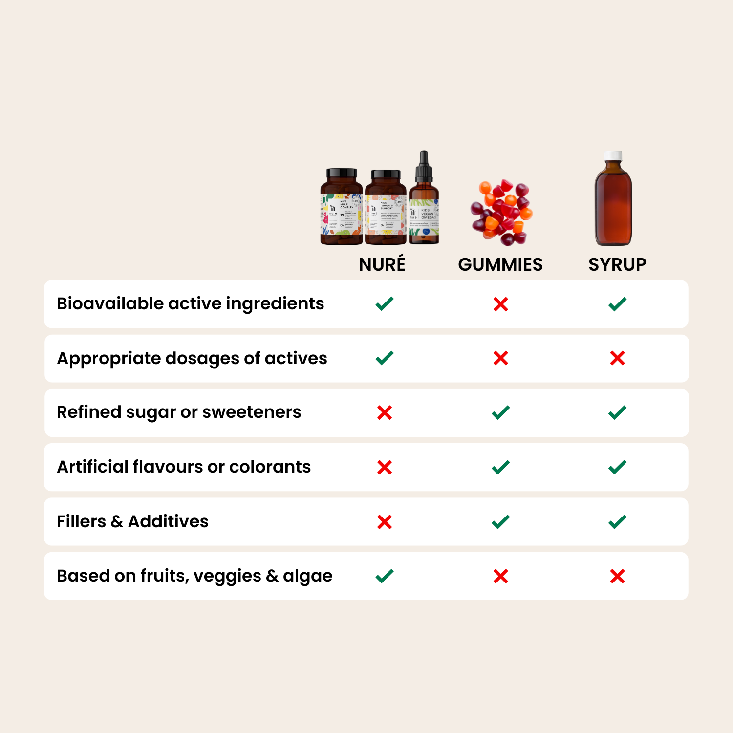 Most supplements for kids are overloaded with synthetic vitamins, chemicals, refined sugars, additives, and fillers, making them far from healthy. At Nuré Nutrition, we set a new standard. Our supplements are based on bioavailable premium actives, mixed with fruits, veggies, plants, and seaweed. They’re clean, well-formulated, genuinely beneficial—and most importantly, loved by kids!