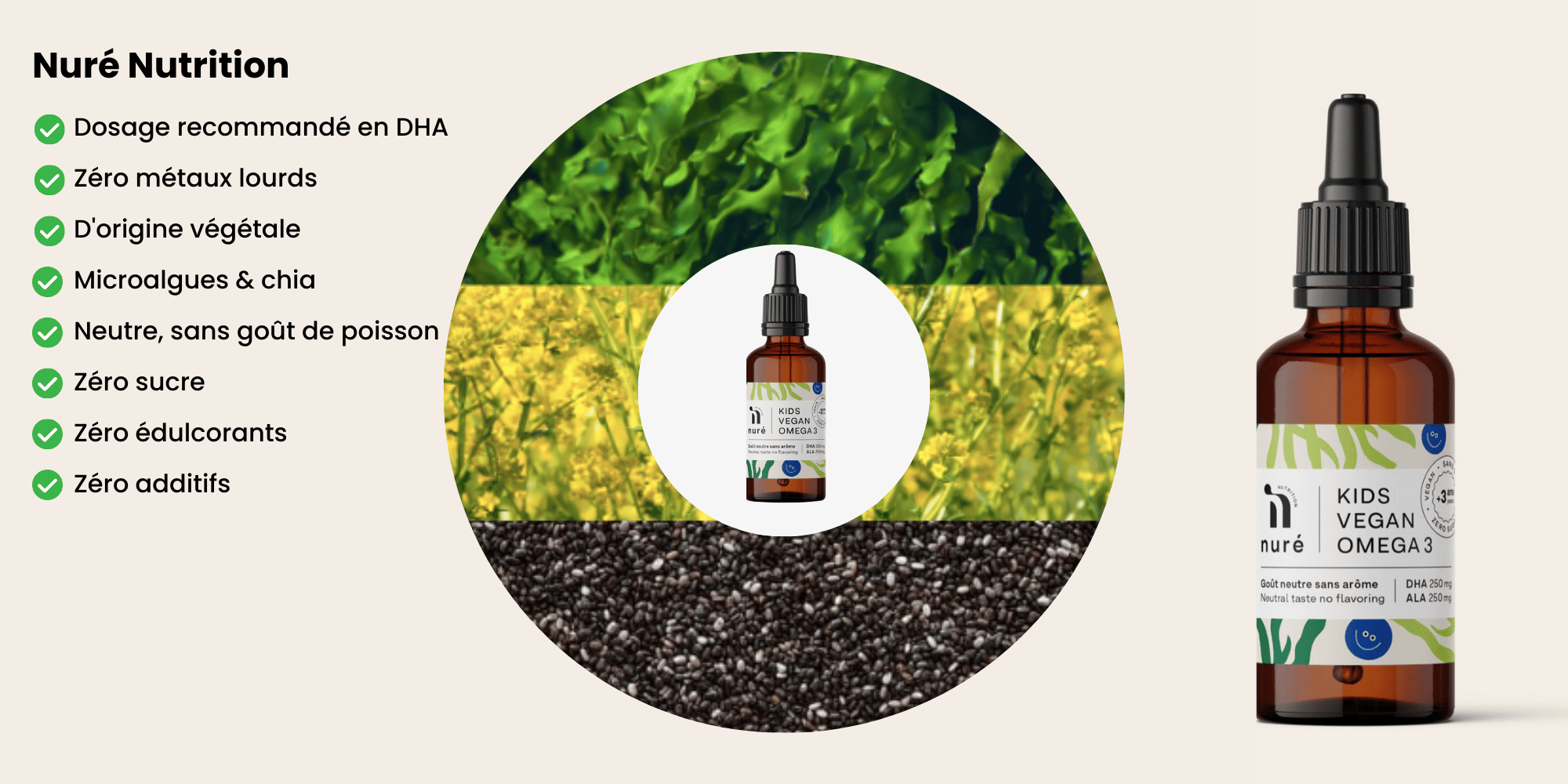 Les oméga-3, en particulier le DHA, sont essentiels pour le développement du cerveau de votre enfant. Pour répondre à ses besoins en oméga-3, il devrait consommer 2 à 3 portions de poissons gras comme le saumon, les sardines, le maquereau ou le hareng chaque semaine. Si cette recommandation est respectée, un supplément n’est pas nécessaire. Si votre enfant ne mange qu'une seule portion de poisson gras par semaine, vous pouvez compléter avec 1 portion de notre huile Oméga-3, 4 fois par semaine. Si votre enfant ne mange pas de poisson gras ou seulement de façon occasionnelle, une portion quotidienne de notre huile Oméga-3 lui garantira un apport optimal en oméga-3